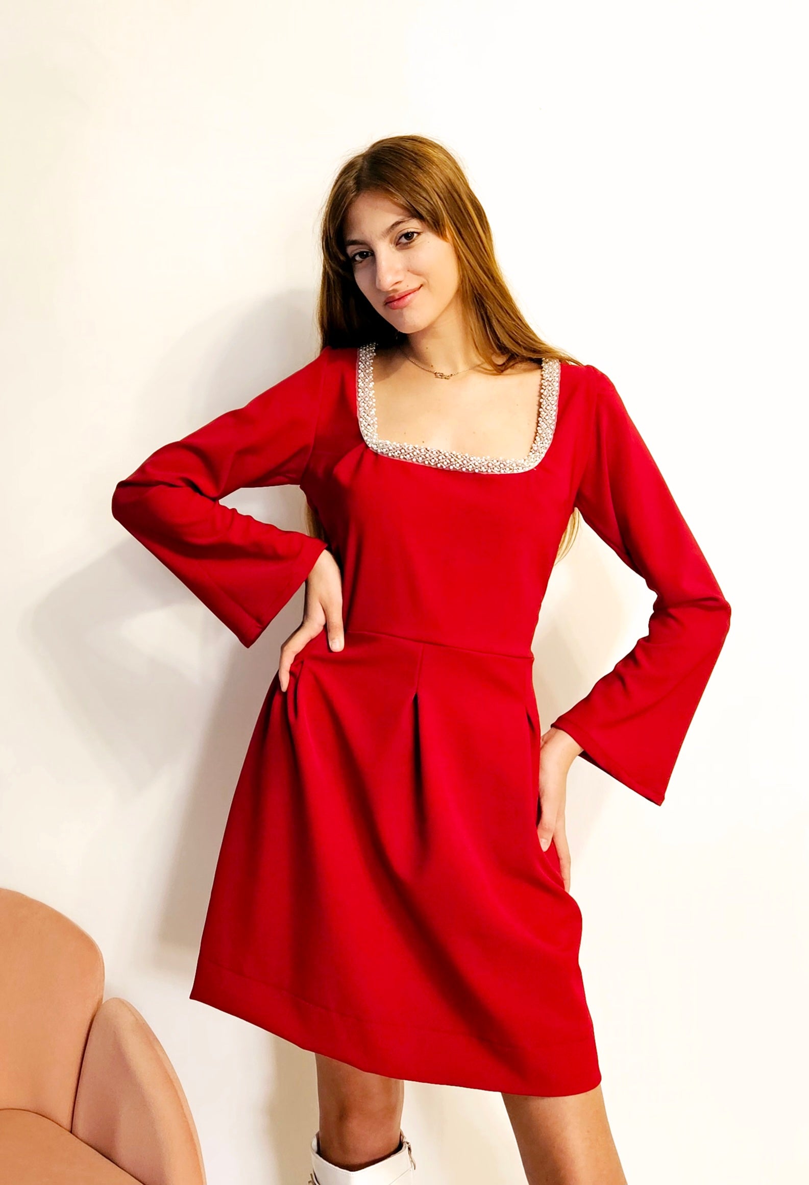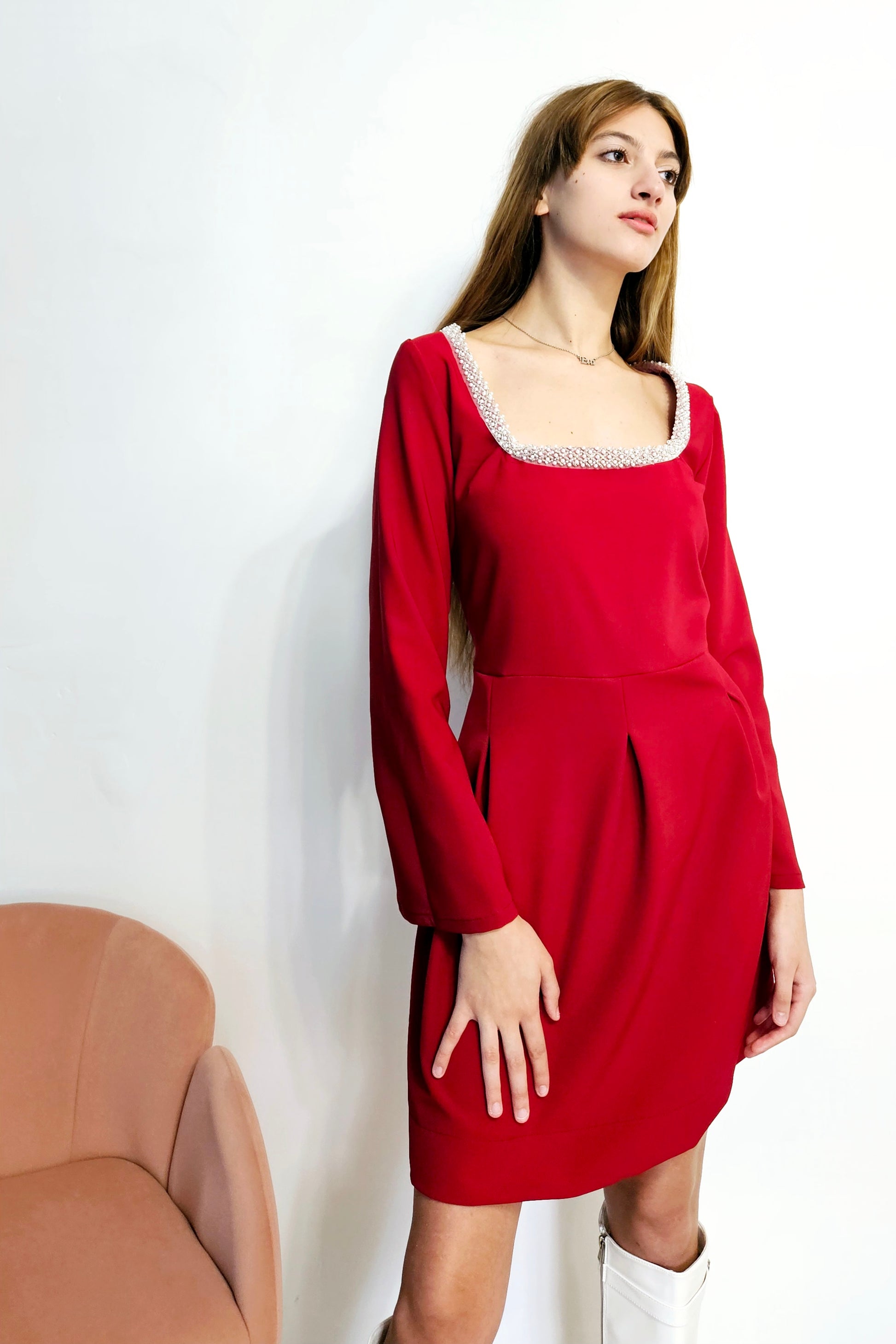 Vestito rosso cremisi con perline sulla scollatura. Manica a trombetta e gonna a pieghe. Semi elasticizzato. Scollatura squadrata. Fatto a mano in Italia, pezzo unico