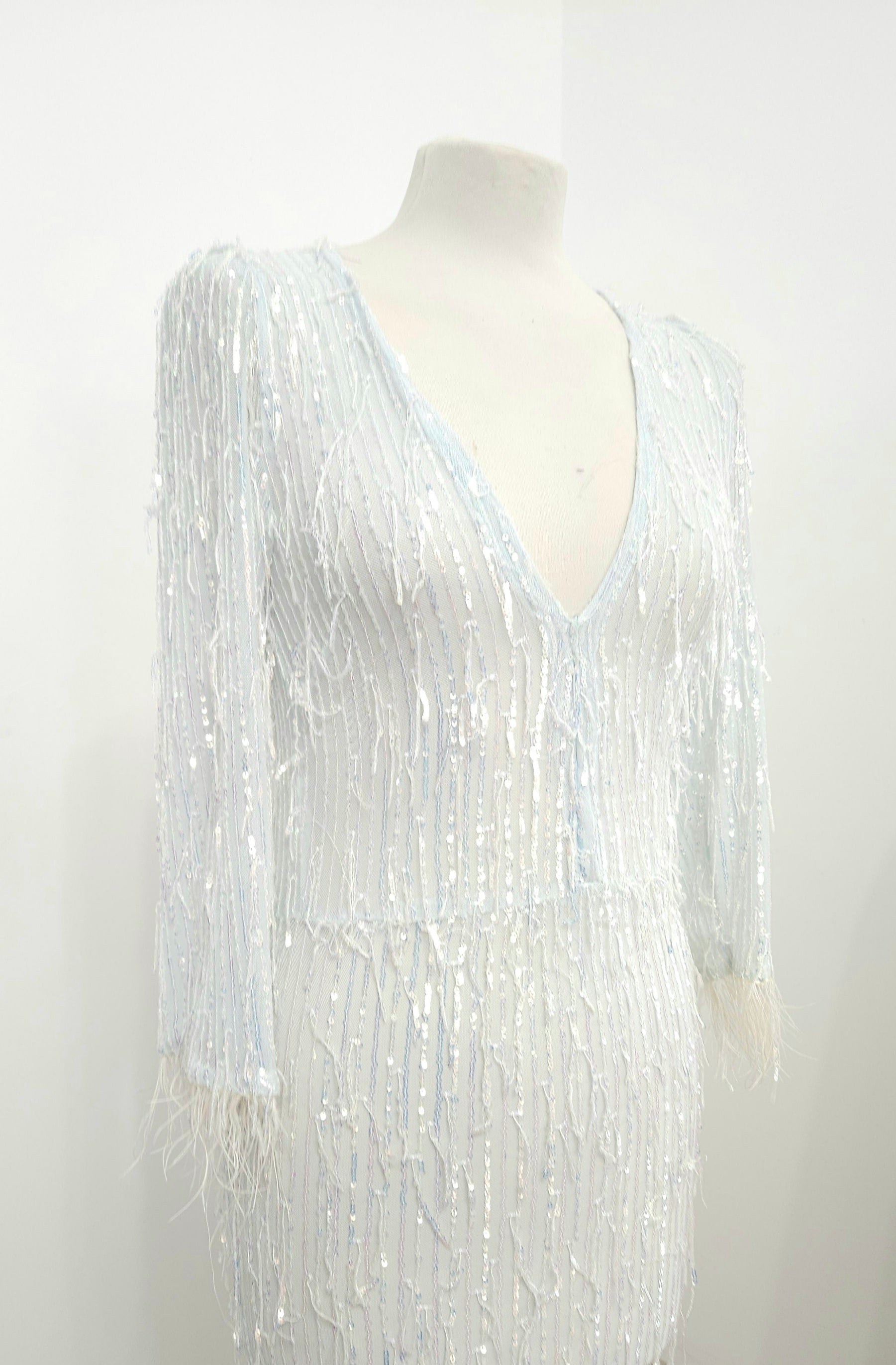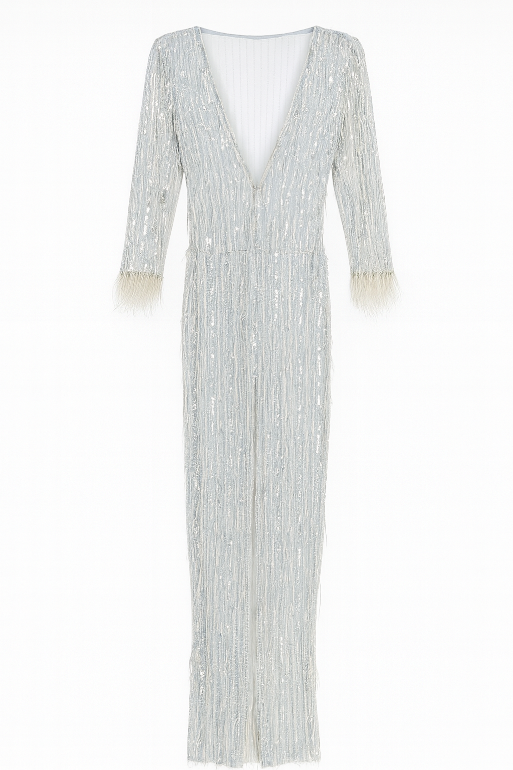 Il tessuto ha una base in tulle elasticizzato sul quale sono stati cuciti i pendenti. Sull'orlo della manica sono state applicate le piume di struzzo.