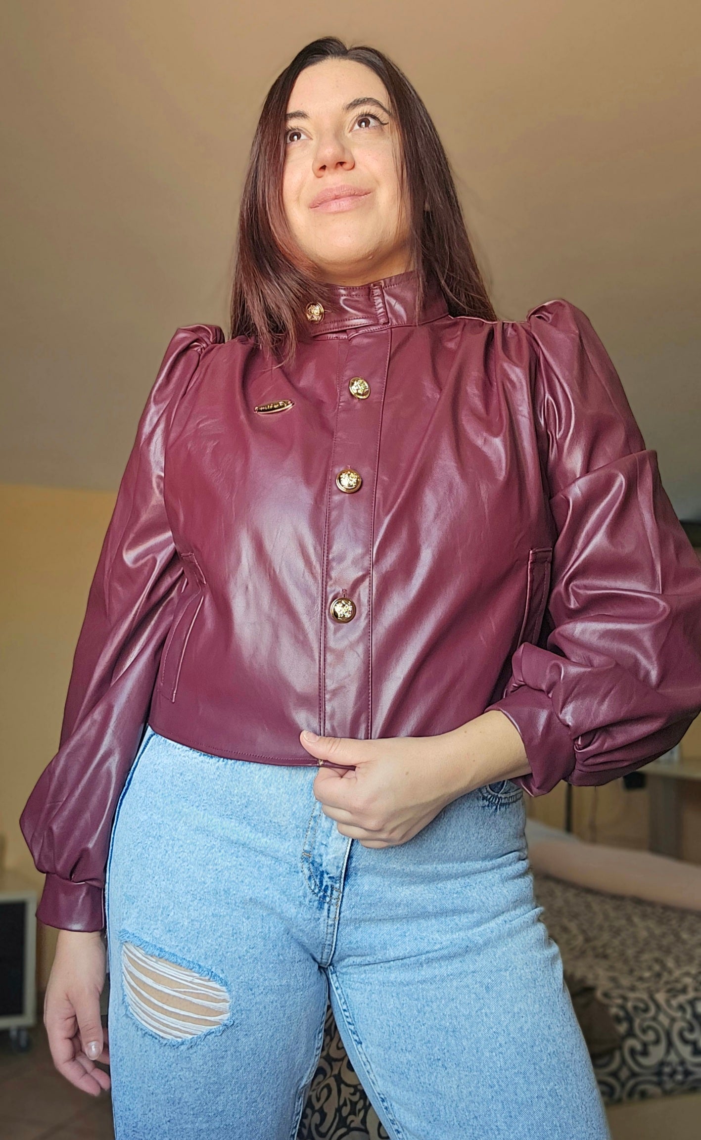 Giacca bordeaux con maniche a palloncino e collo alto.