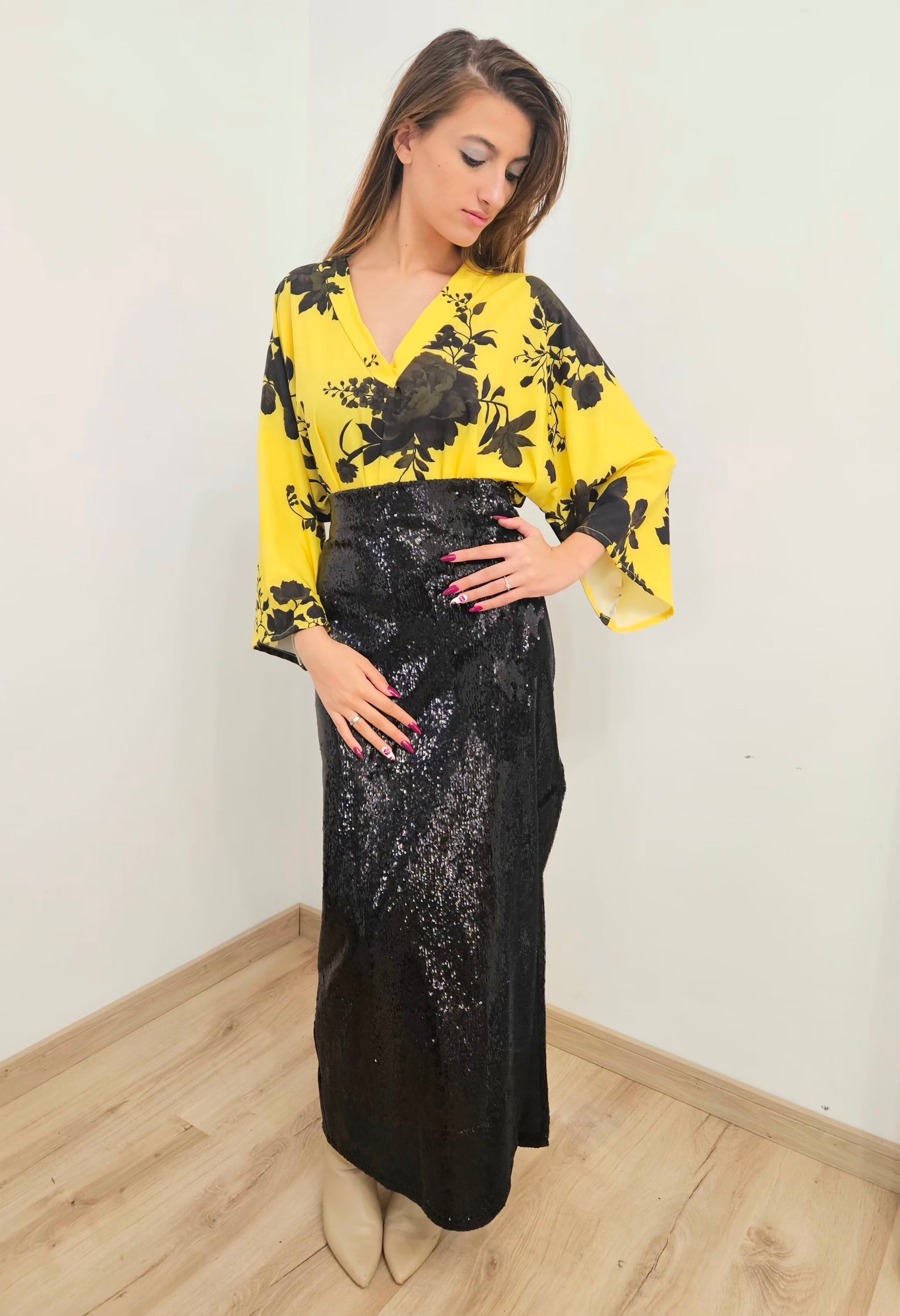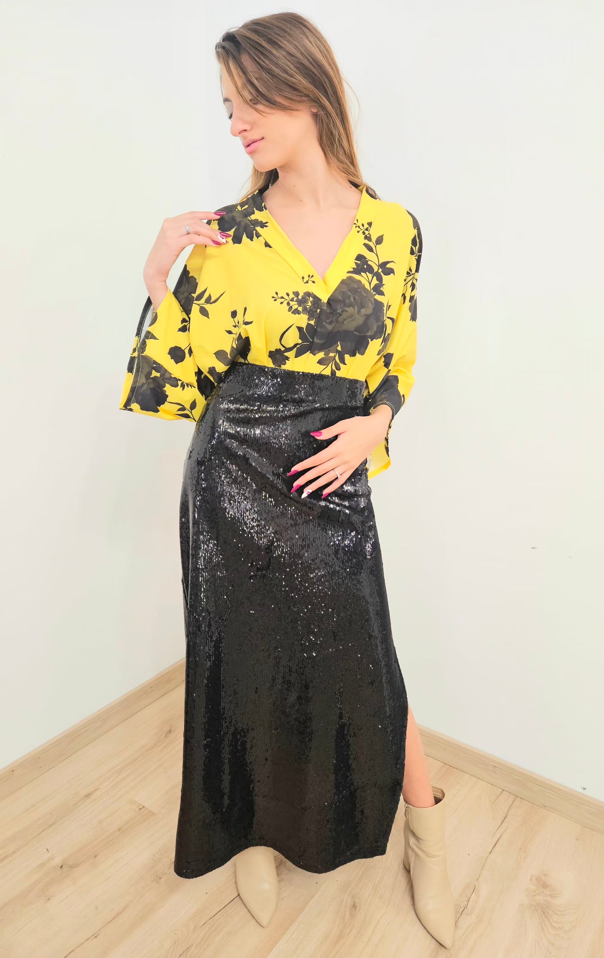Gonna midi di paillettes nera, spacco laterale ed elastico in vita. Pezzo unico fatta a mano. Taglia unica fino la 48