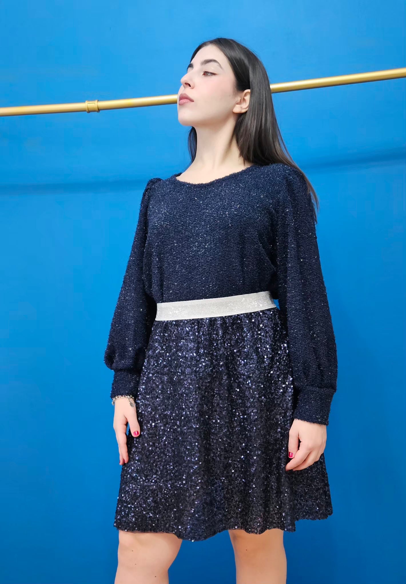 Gonna di paillette blu, lunga al ginocchio, aderente ed elasticizzata. Pezzo unico fatta a mano. Taglia 42/44/46. Elastico in vita