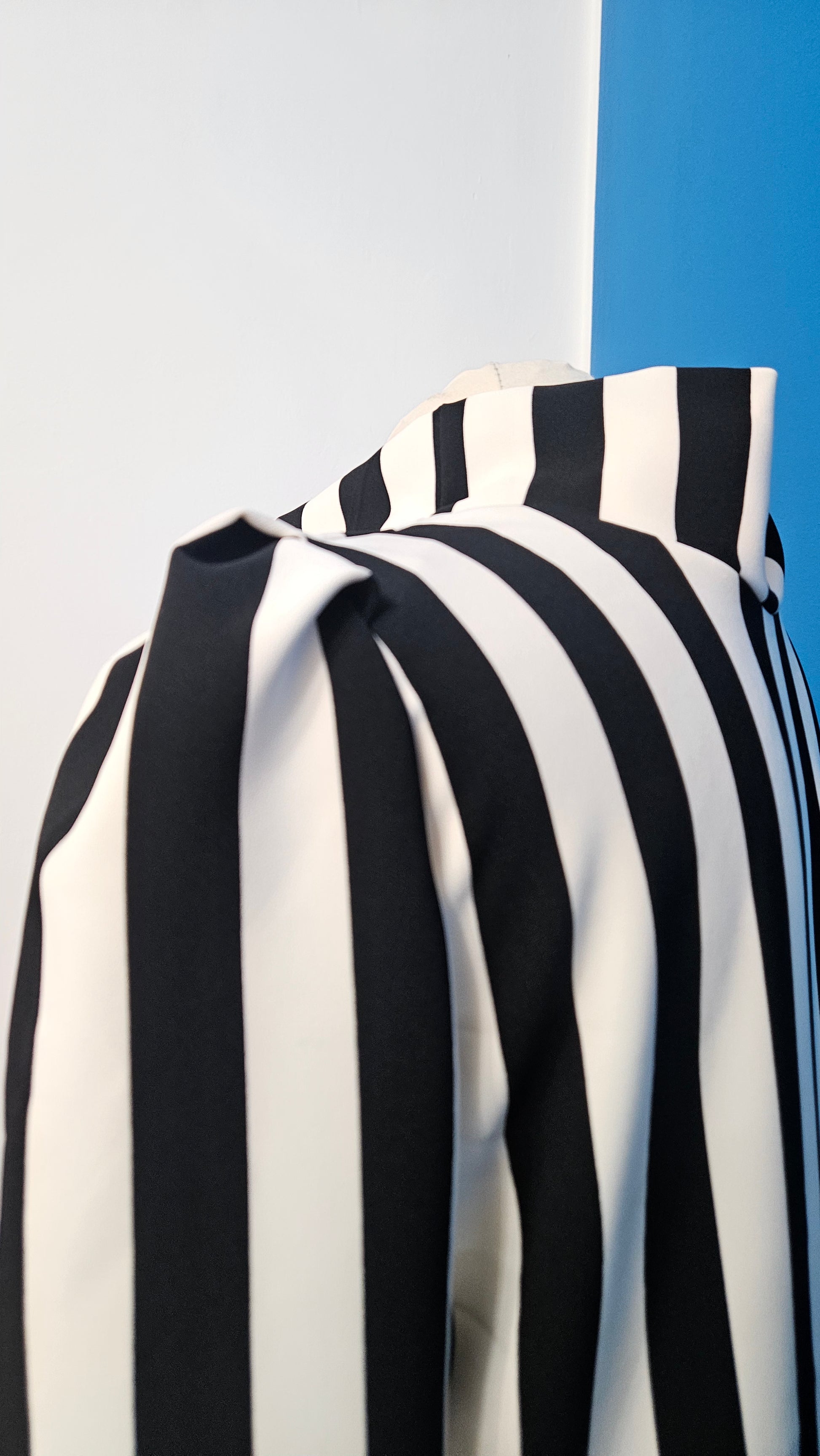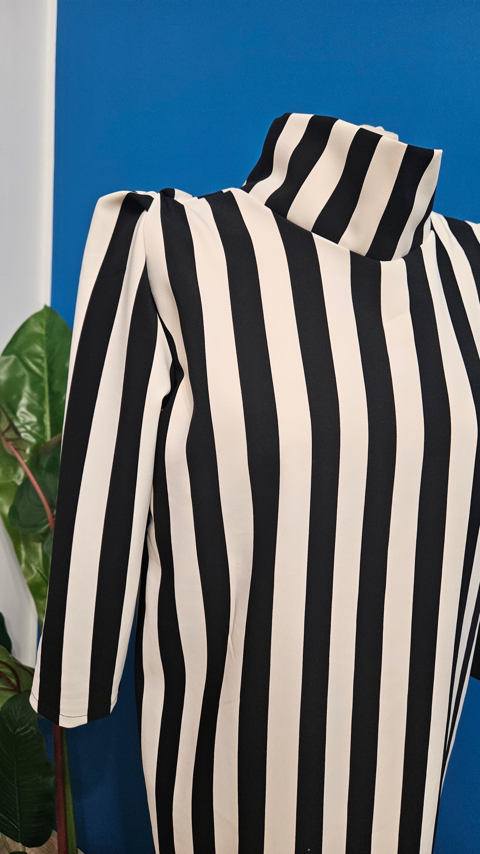 Vestito a righe bianco e nero, taglia 42/44, collo alto e maniche con pieghe sulla spalla