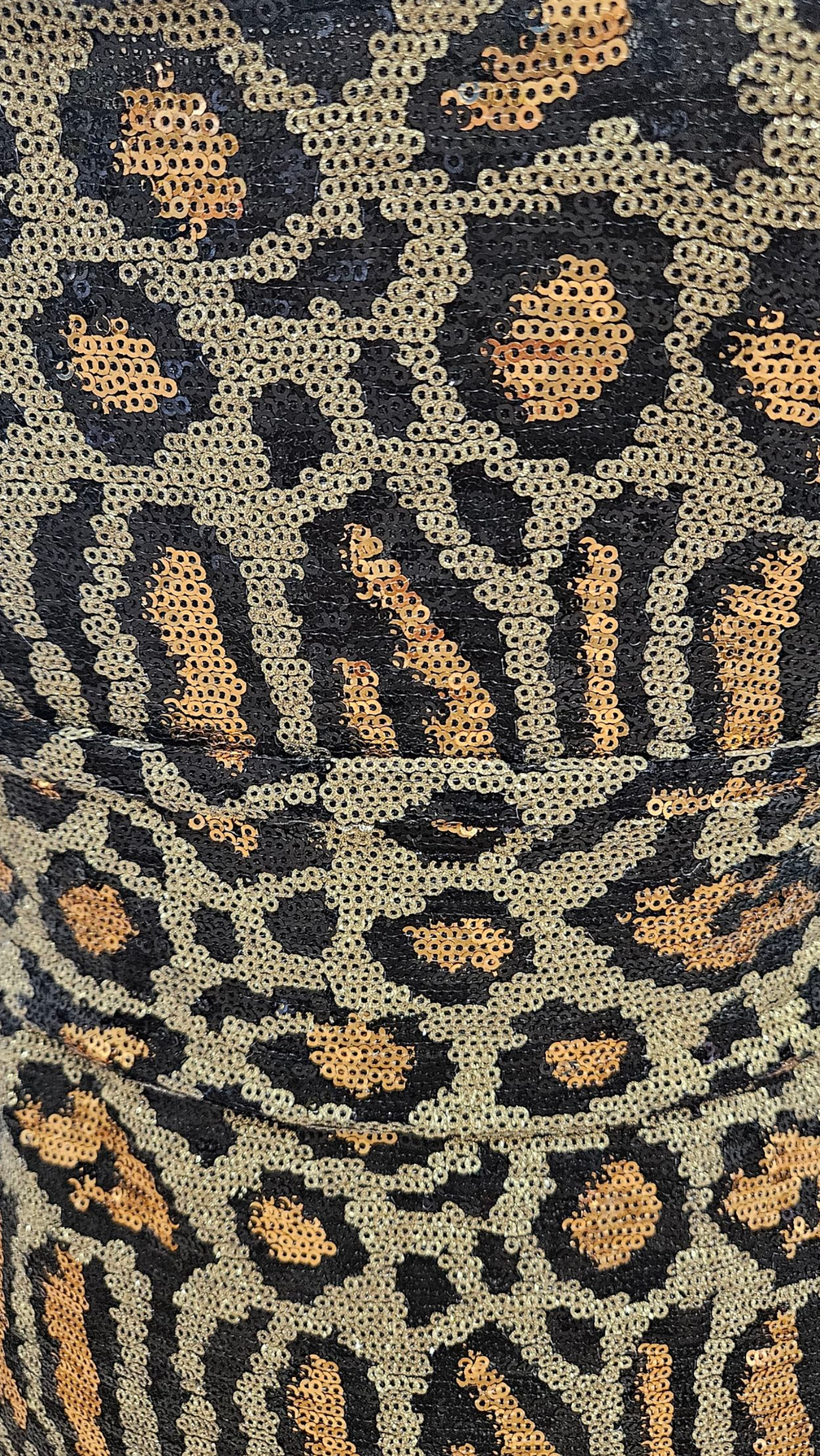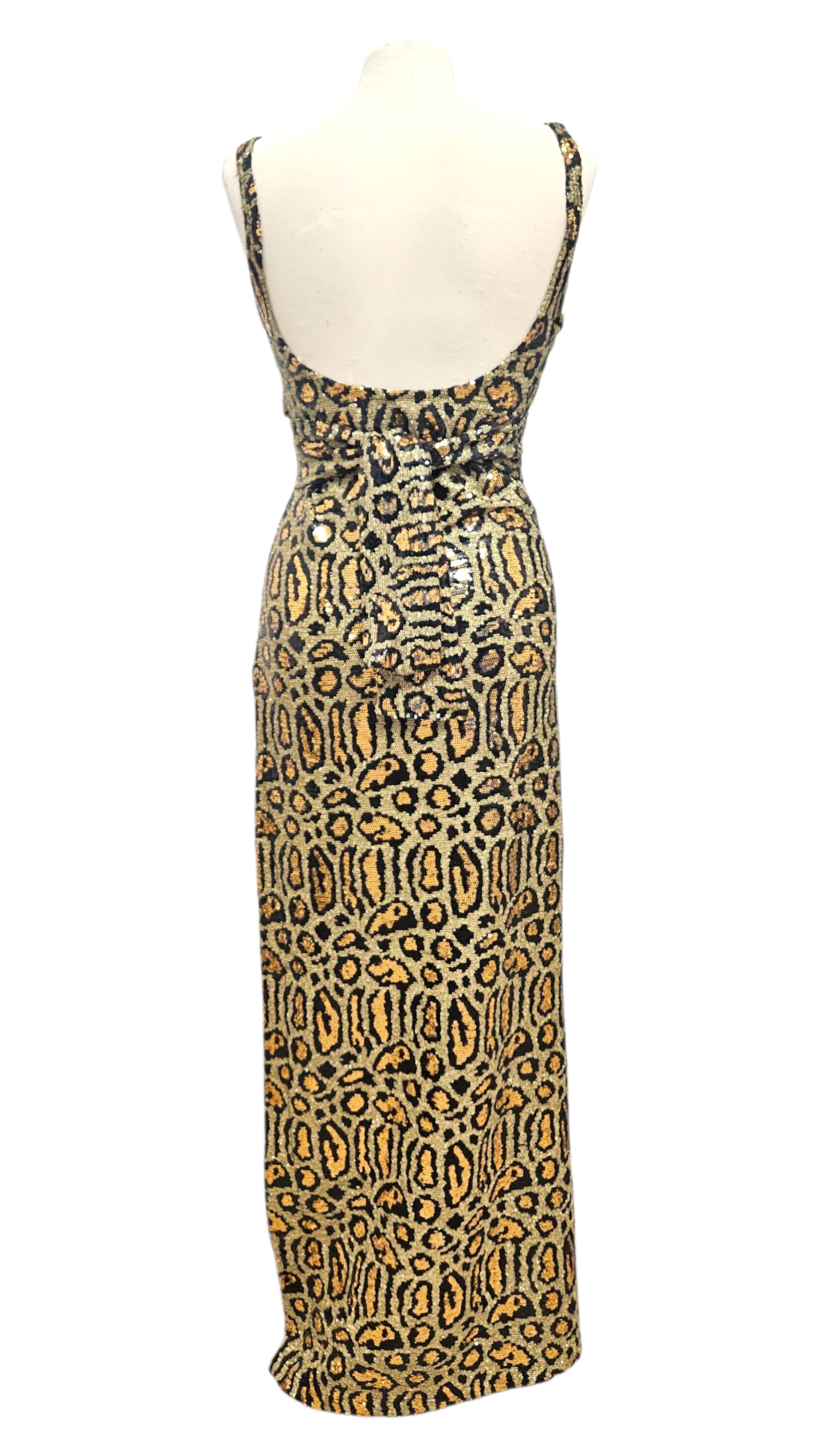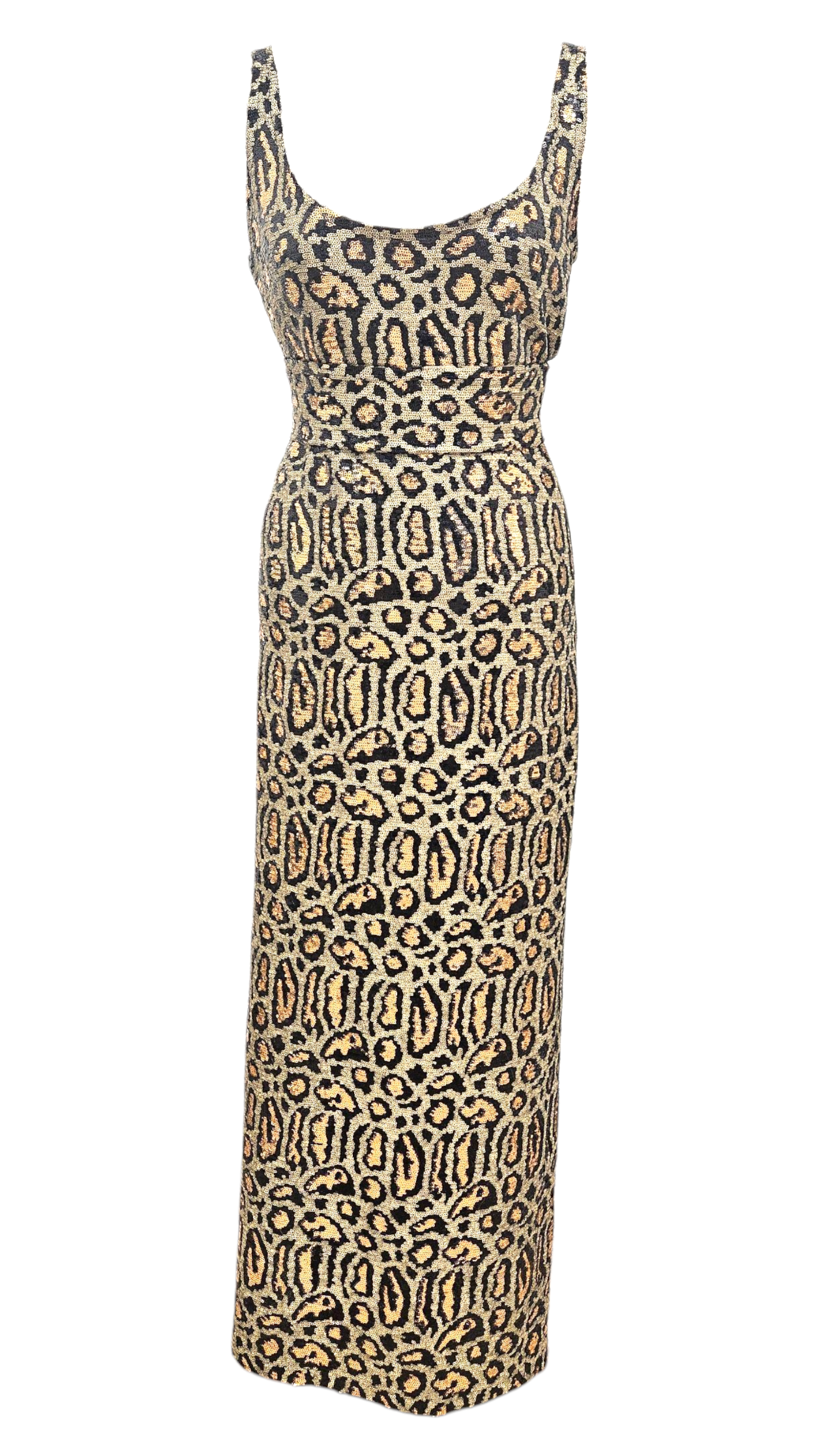 Abito lungo di paillettes elasticizzato fantasia maculato. L'abito è aderente con scollatura rotonda e spalline