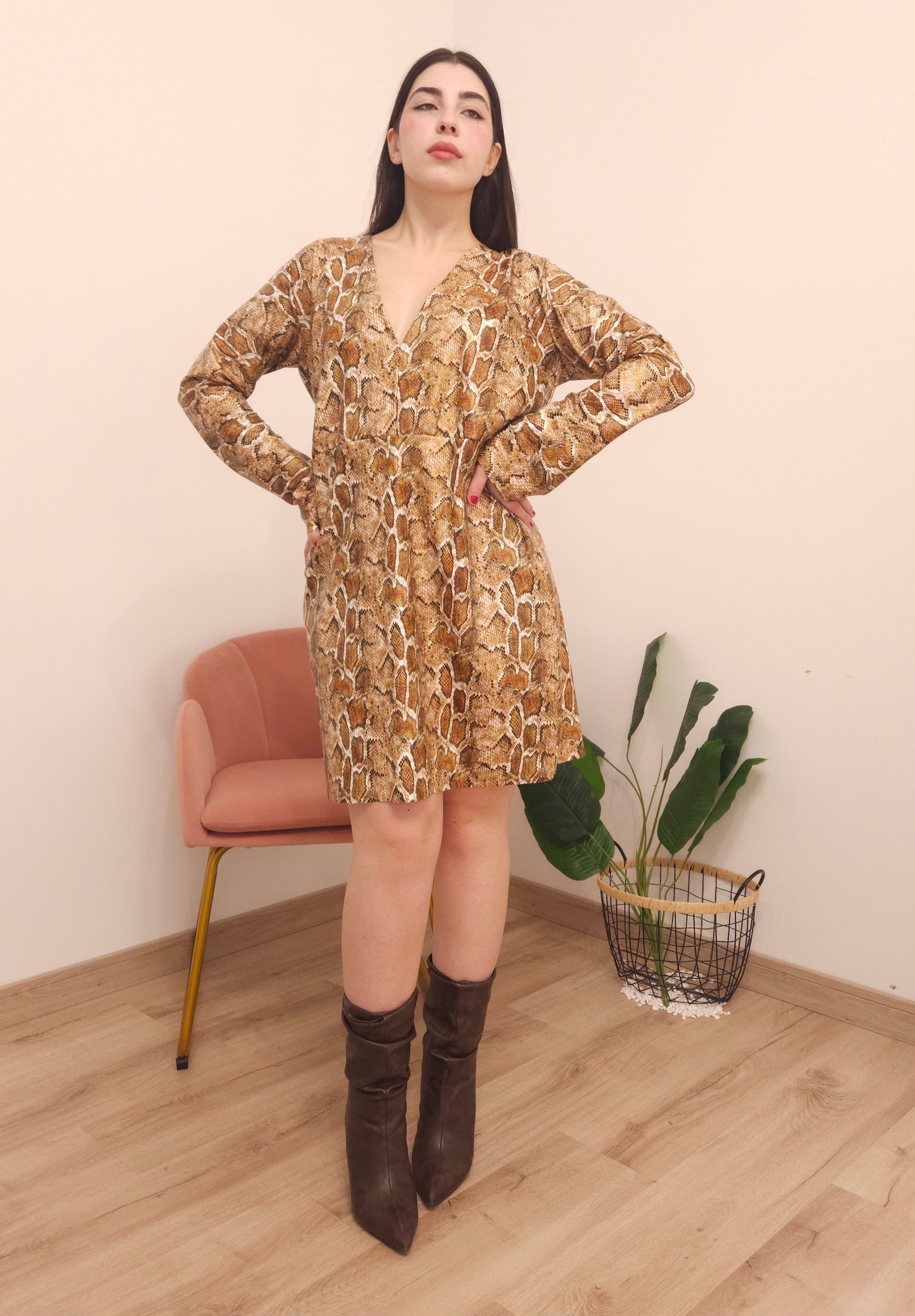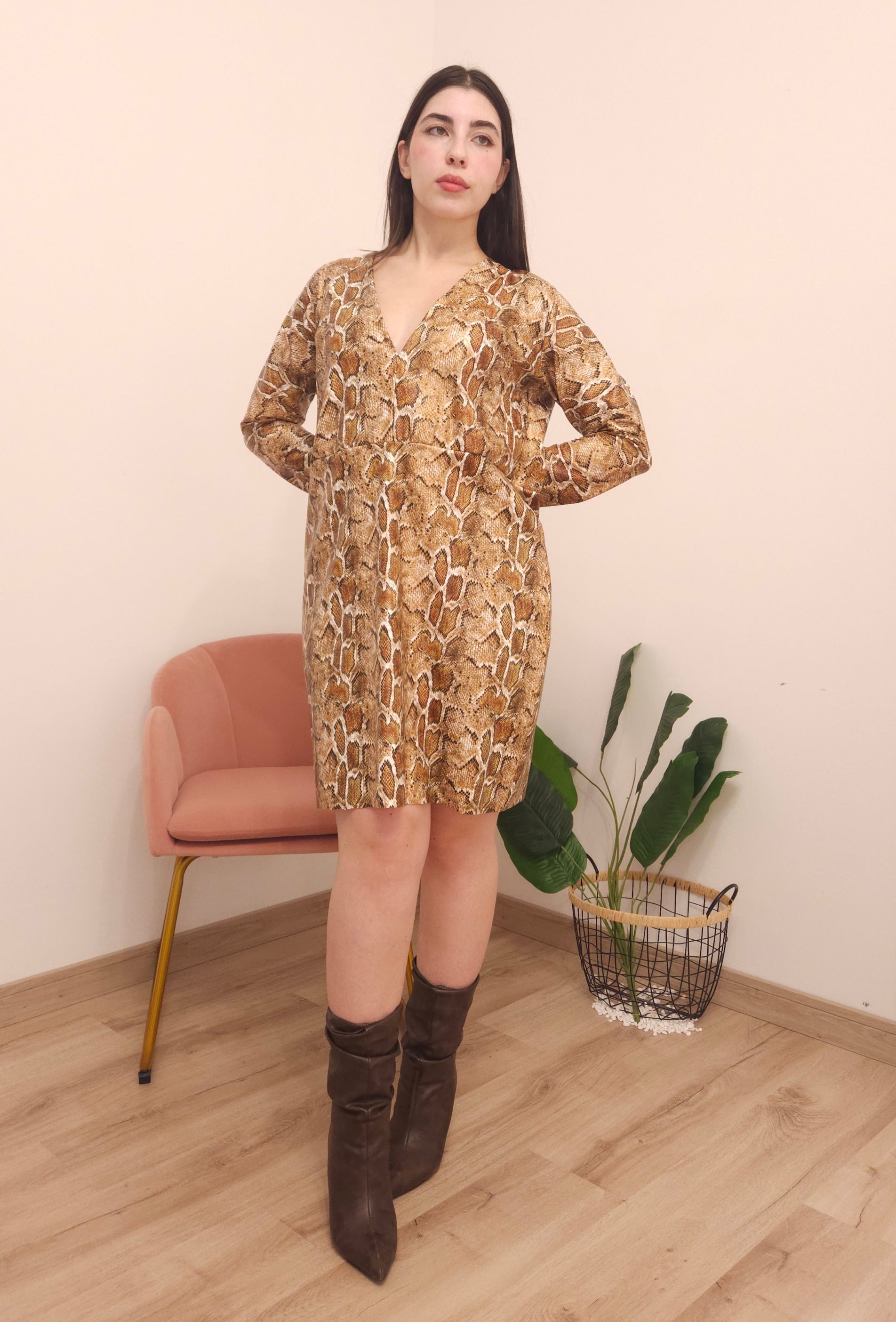 Vestito corto di simil pelle fantasia pitonata, maniche lunghe scampanate e scollatura a V